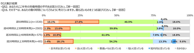 子供が親の働く時間を「長い」「長すぎる」と評価している割合は、週50時間以上勤務している親で最も高く、37.7%だった。一方で、週30時間未満でも「長い」と感じる回答があり、労働時間と評価には個人差があるとされている。