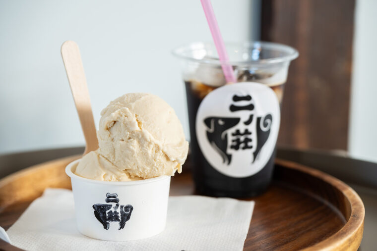 カフェでは、添加物不使用のクラフトアイスクリーム(660円~)や『ニノ荘ブレンド by三角フラスコ』(550円)、ランチメニューを提供。