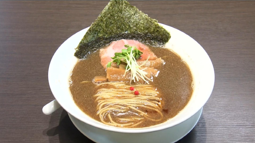 白い丼に注がれた濃い茶色のスープ、そしてチャーシュー、メンマ、のりがトッピングされています。