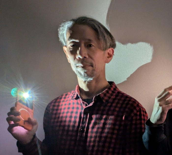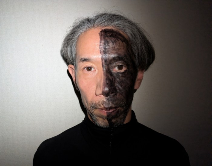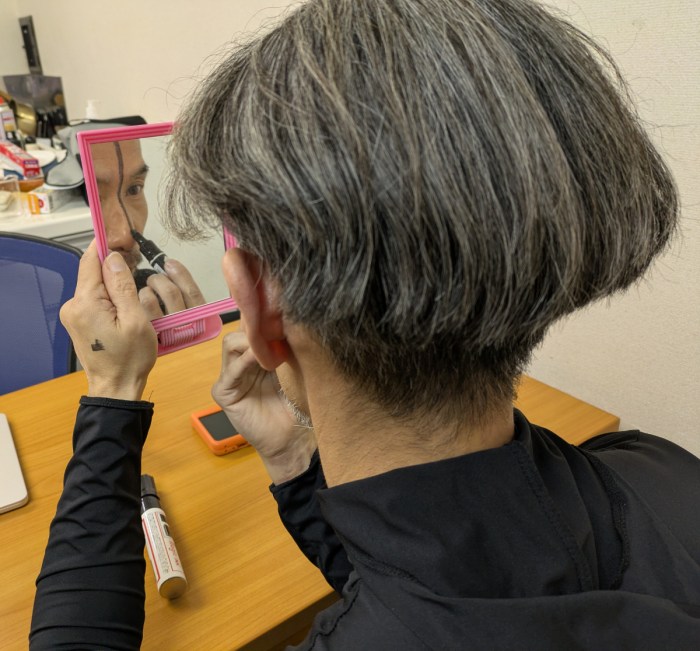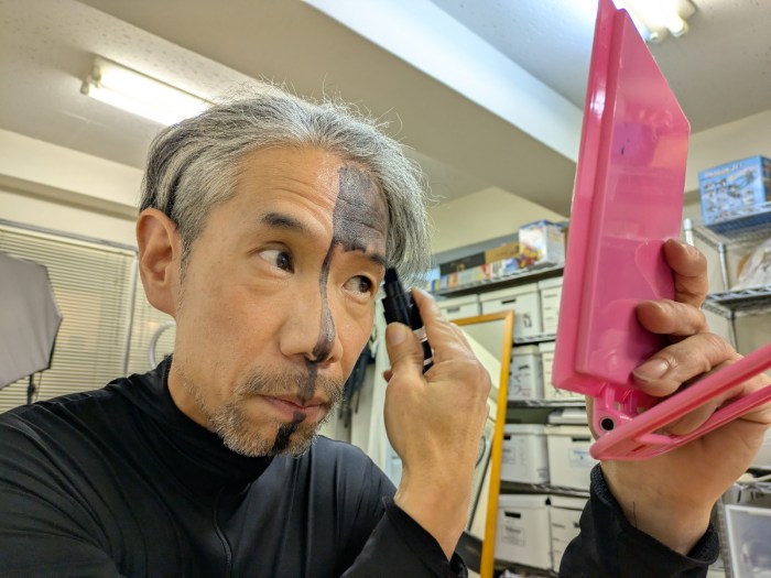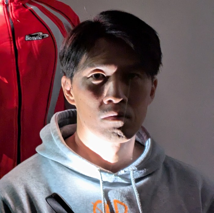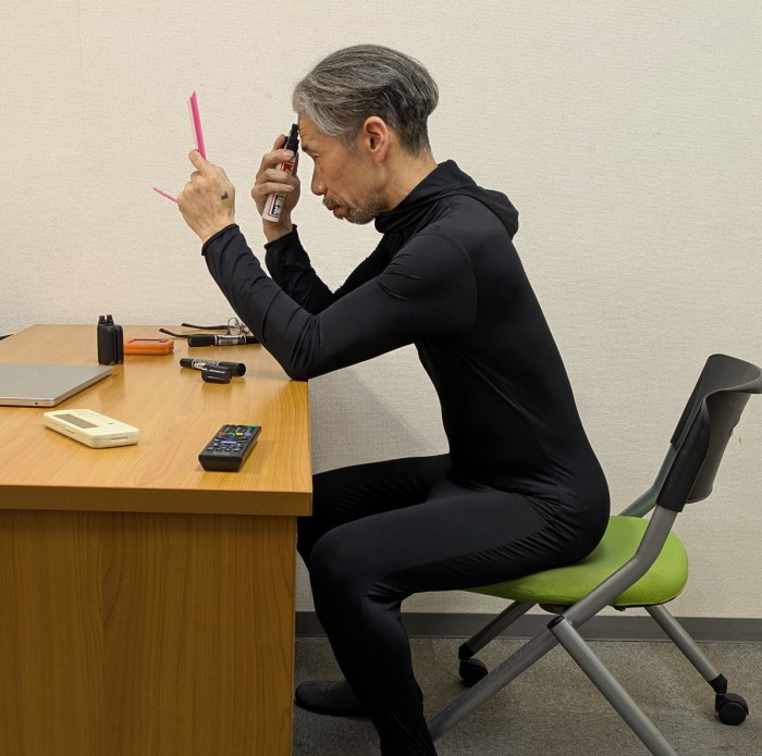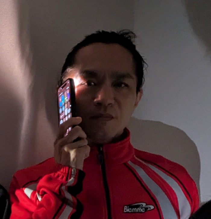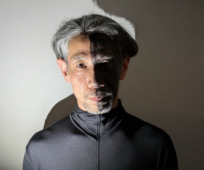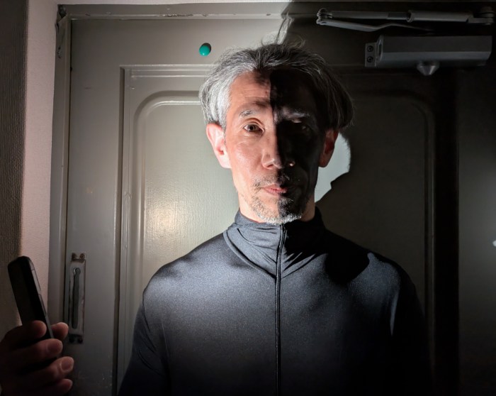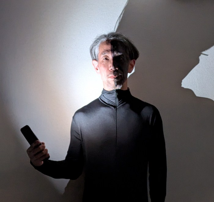 部屋を真っ暗にして、撮影するわけだが、コンプレックス再現のときに使った照明は使えない。というのも、光量が強すぎて顔半分だけを照らすことができないからだ。おそらく全身明るくなってしまうはず。そこでスマホカメラのライトで、各々の顔半分を照らしてみることにした。