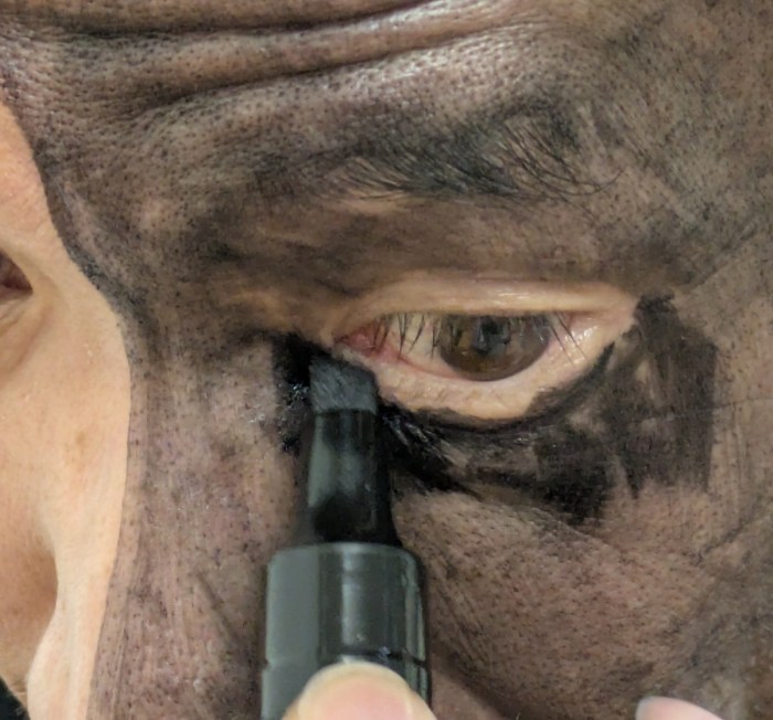 マジックで物理的に影を描いたぞ! これで撮影すれば顔半分がキレイに暗くなるはず。