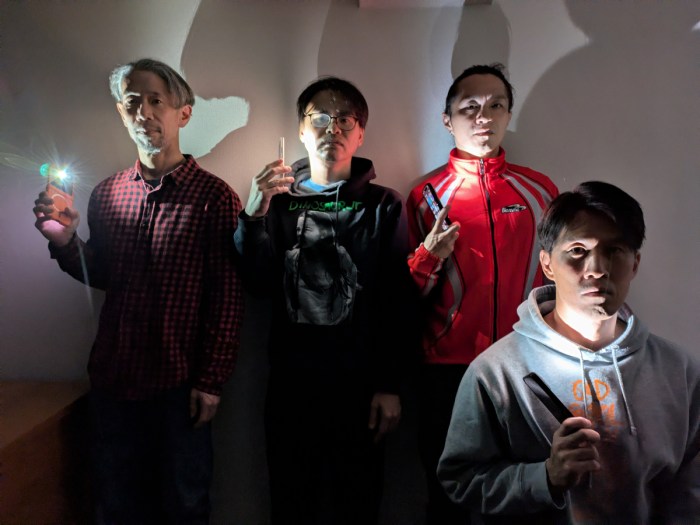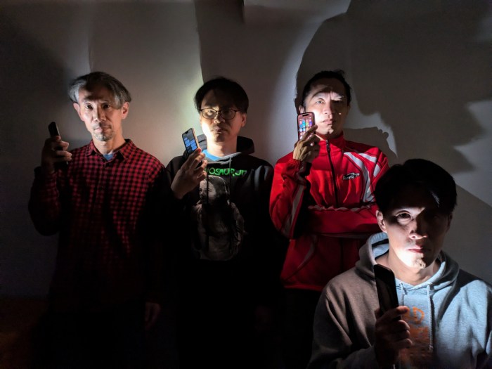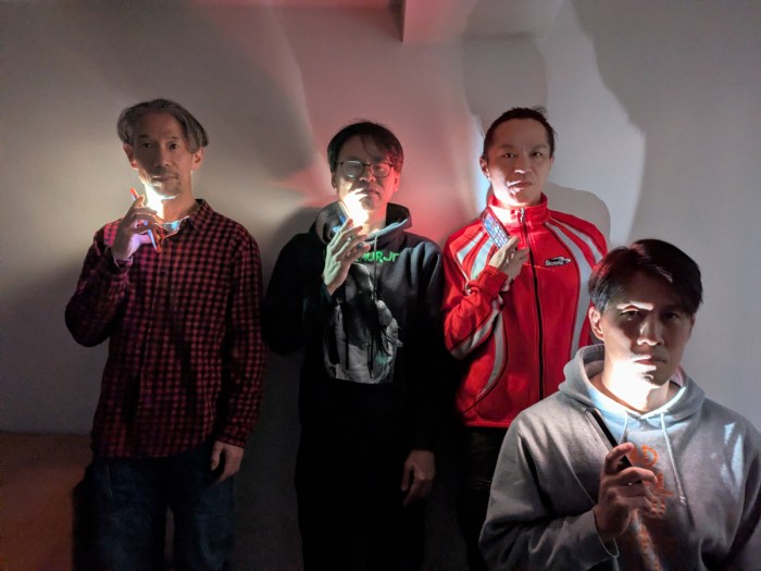 おそらくこれが、今できる限界なんじゃないかな。そもそもスマホライトが後ろの壁を照らしてしまうから、全体が明るくなっちゃうんだよなあ。それから後ろの3人は隣り合う光に照らされてしまうし。