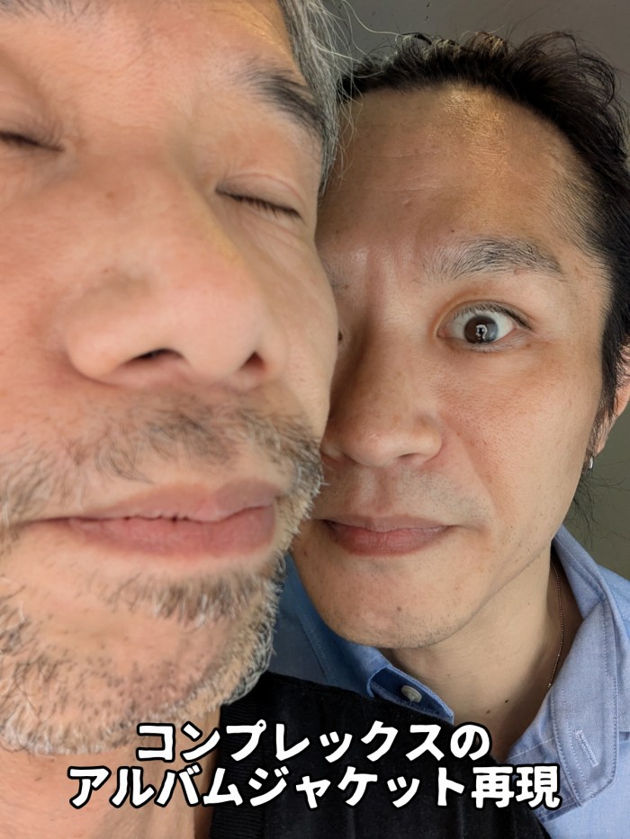 前回のコンプレックスは、布袋さん・吉川さんのお2人が顔を寄せ合うジャケットデザインの再現だった。照明を5灯用意して、カメラの前で私と羽鳥が顔を寄せ合っての撮影。完ぺきとは言わないまでも、かなり良い形で再現できたんじゃないかなあ、うん。