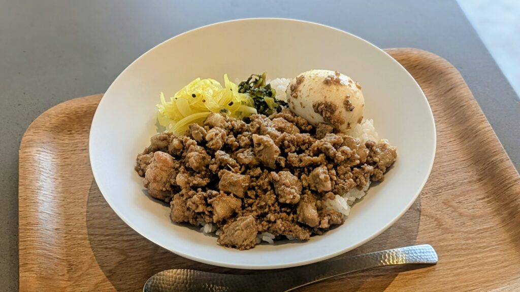 なかでもおすすめは、店主こだわりの「ルーロー飯」。細かく刻んだ豚バラ肉とひき肉を、シナモンを効かせた甘めのオリジナルスパイス煮汁でじっくりコトコト煮込み、旨みを凝縮。添えられた横須賀産の煮卵や、自家製玉ねぎアチャール、高菜との相性も抜群で、しっかりと満足感のある一皿に仕上がっています。