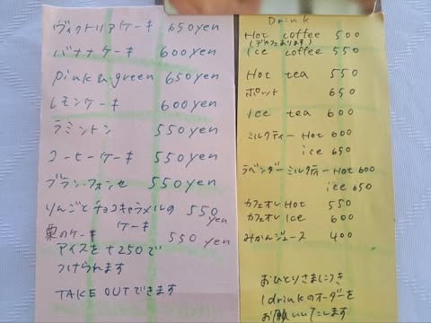Banbiのメニューはケーキとドリンクになります。 季節によって内容が変わるため、店主の手書きです。