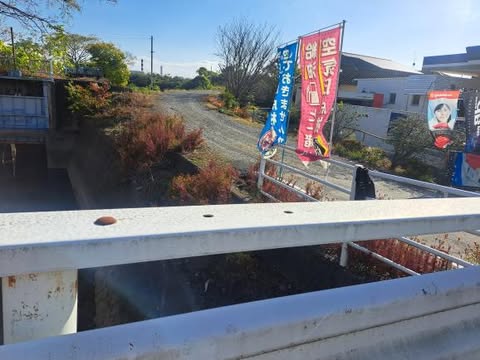 ガソリンスタンドから車で約1分(徒歩約5分)ほど川沿いの道を行くと
