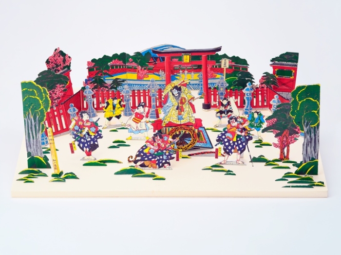 松竹大谷図書館では歌舞伎の演目を描いた組上燈籠絵を161点所蔵しており、公式HP内のデジタルアーカイブでも公開している。この機会に、五枚続の錦絵を組み上げた大作『車引』完成形を間近で観察してみよう。