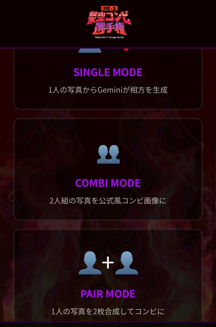 「SINGLE(1人の写真からAIが相方を生成)」「COMBI(2人組の写真を公式風コンビ画像に)」「PAIR(1人の写真を2枚合成してコンビに)」を選ぶ。
