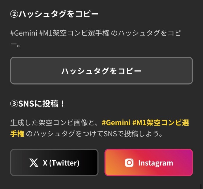 そうそう、生成した画像を「#M1架空コンビ選手権」「#Gemini」 をつけてXまたはInstagramに投稿すると、抽選で100名に「M-1オリジナルグッズ」が当たるという。詳しくは公式サイトをご覧あれ。