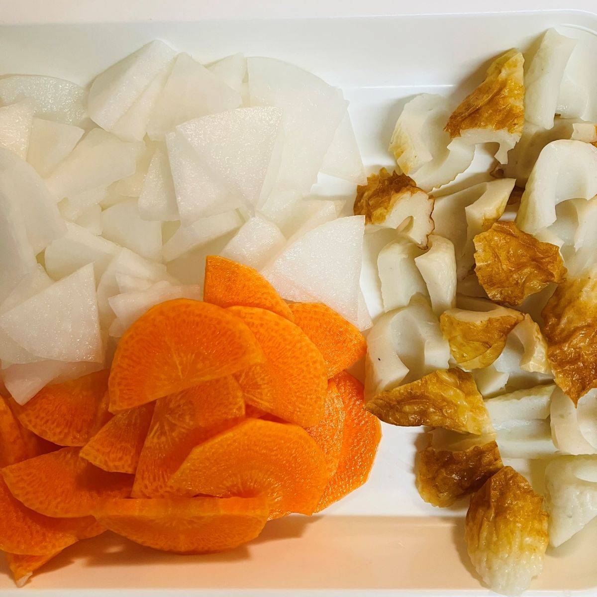大根はいちょう切り、にんじんは半月切りに、ちくわは乱切りにします。