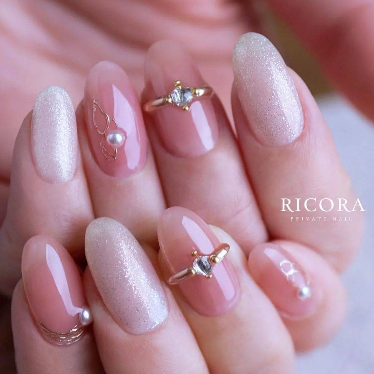 ちゅるんとしたピンクベージュに、人気のリングネイルを重ねたデザインも今っぽい♪