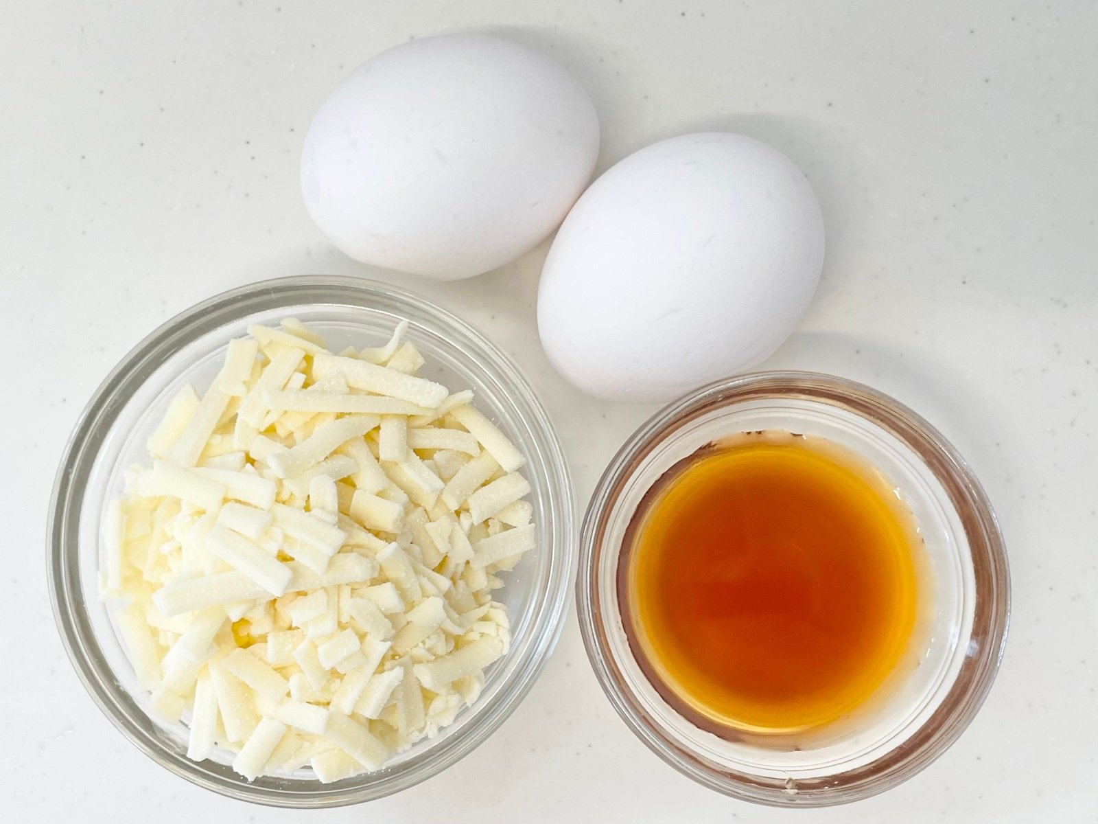 1.中火で熱したフライパンに油適量(分量外)を入れ、溶き卵とチーズ、めんつゆを入れます。全体を混ぜながら、お好みのかたさになるまで加熱します。
