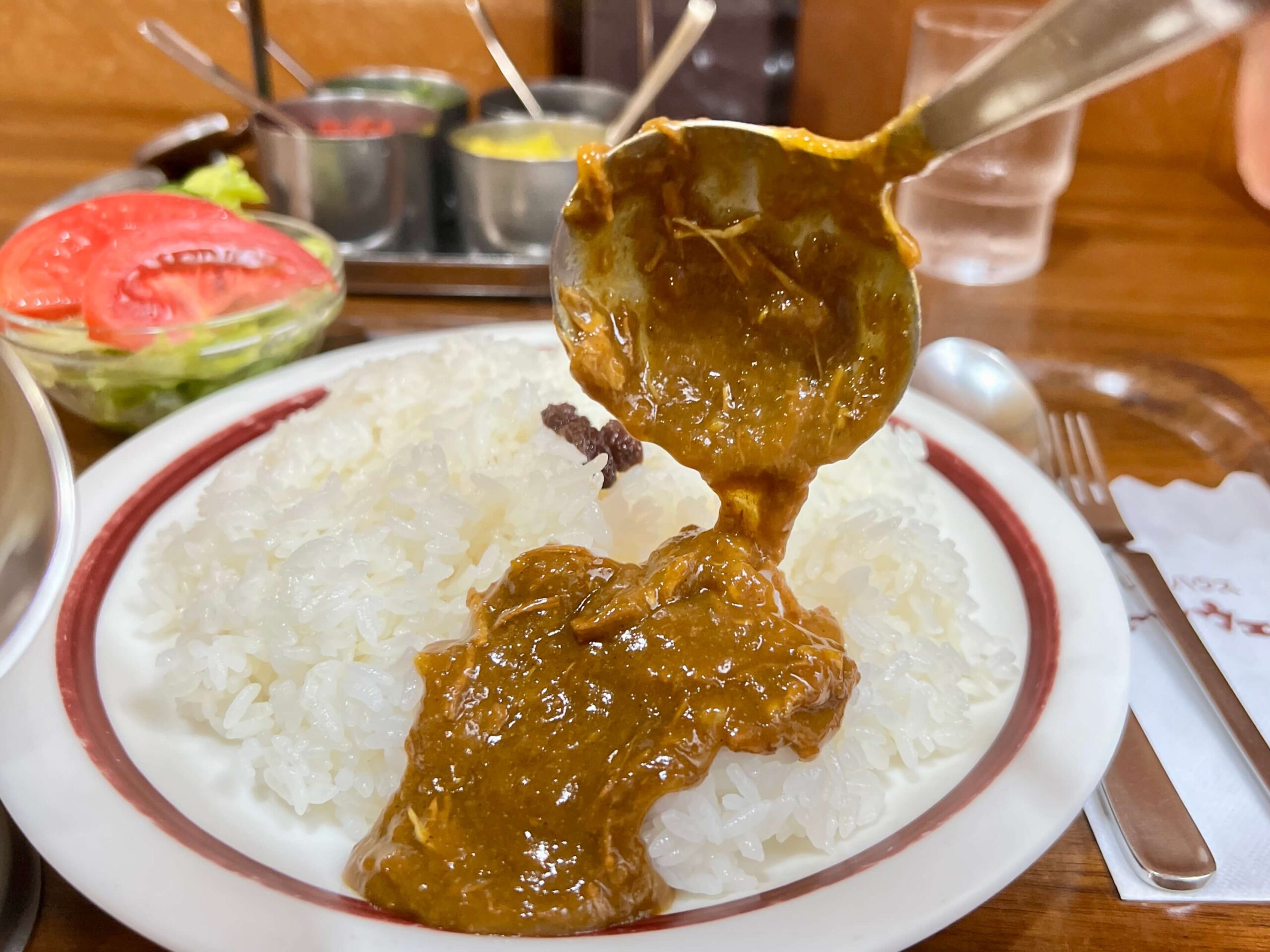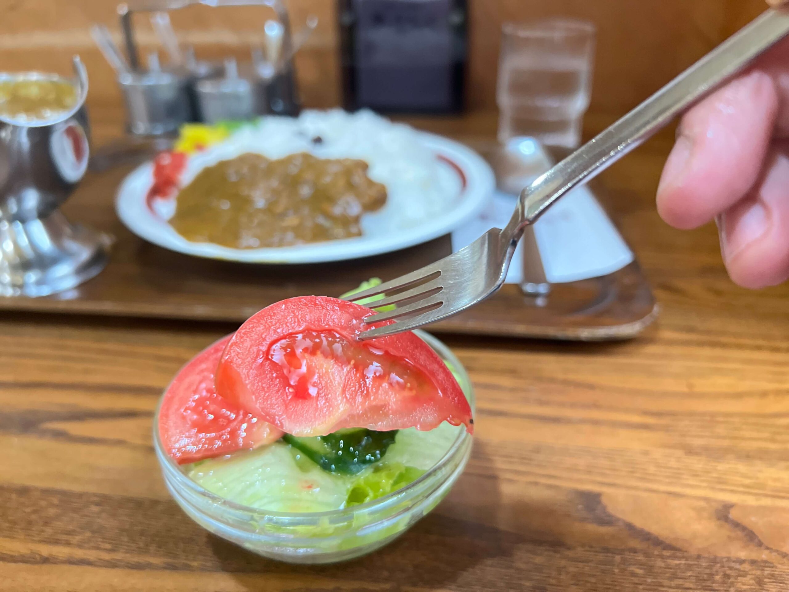 ぜひサラダが冷たいうちに一口食べてみてほしいのですが、濃厚なカレーを食べている最中にも食べたくなるので、最初に全部食べ切らない方が良いと思います。