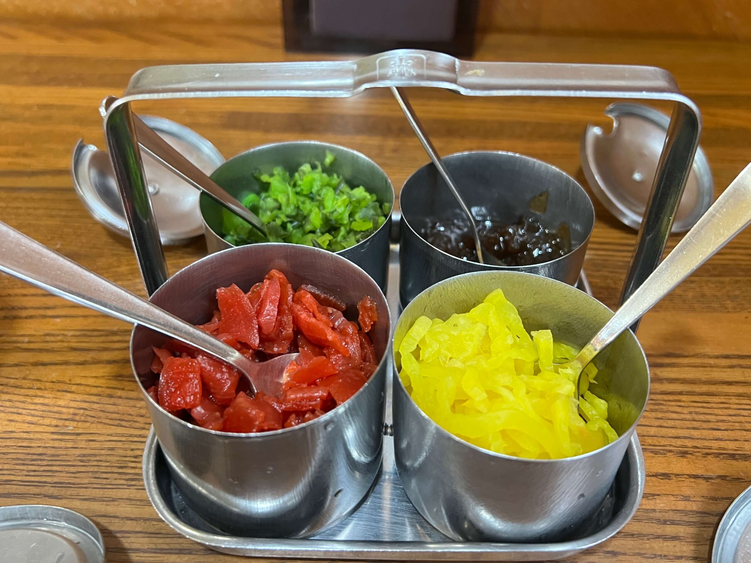 カレーライスに合わせる4種類の薬味(福神漬け、たくわん、ピーマン塩漬け、チャツネ)が用意されていて、味変も楽しめるのが嬉しいポイントです。