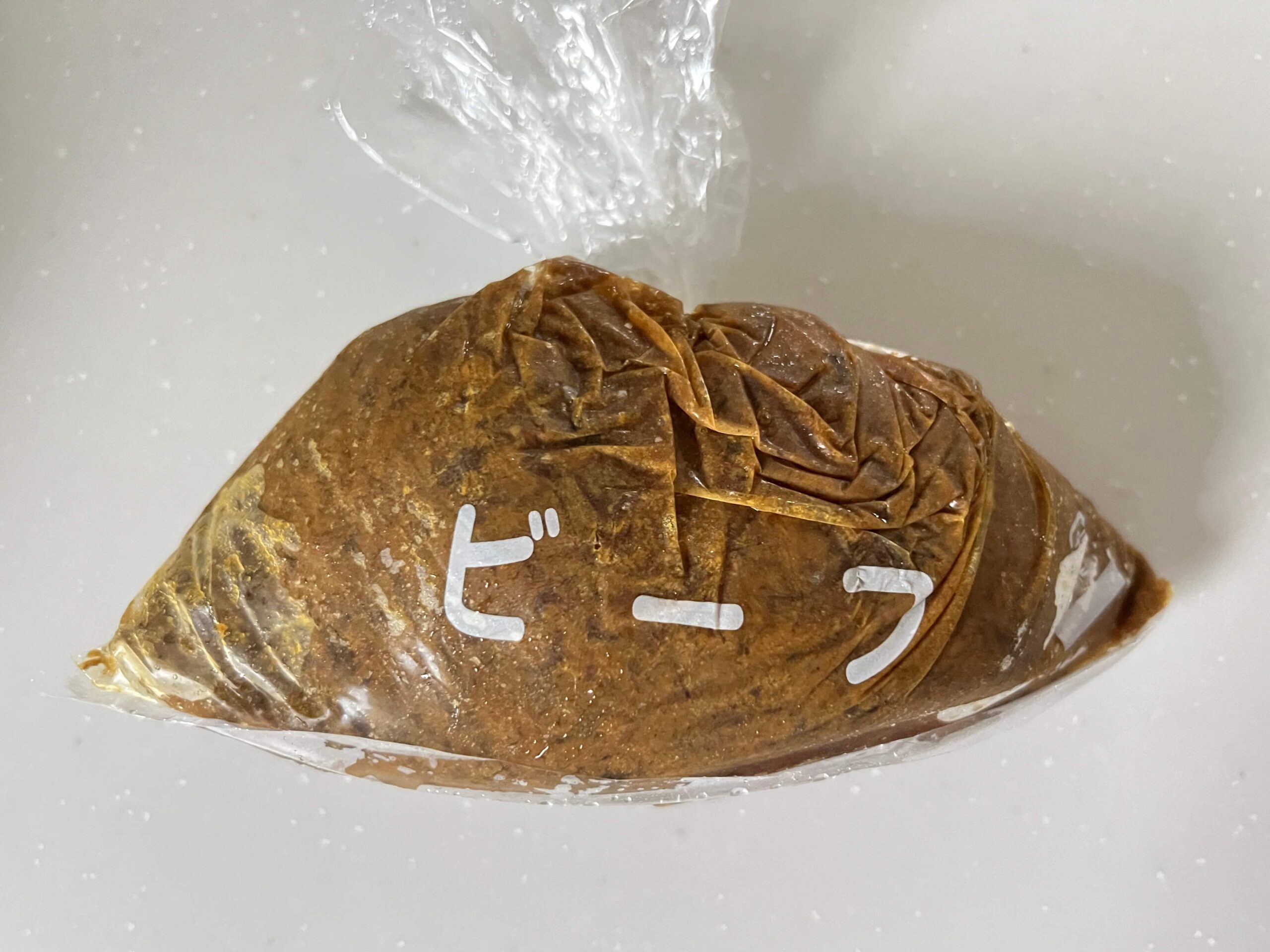 テイクアウトは写真のようにビニール袋に入れて冷凍されています。私は一番人気のビーフカレー570円(税込)にしました。