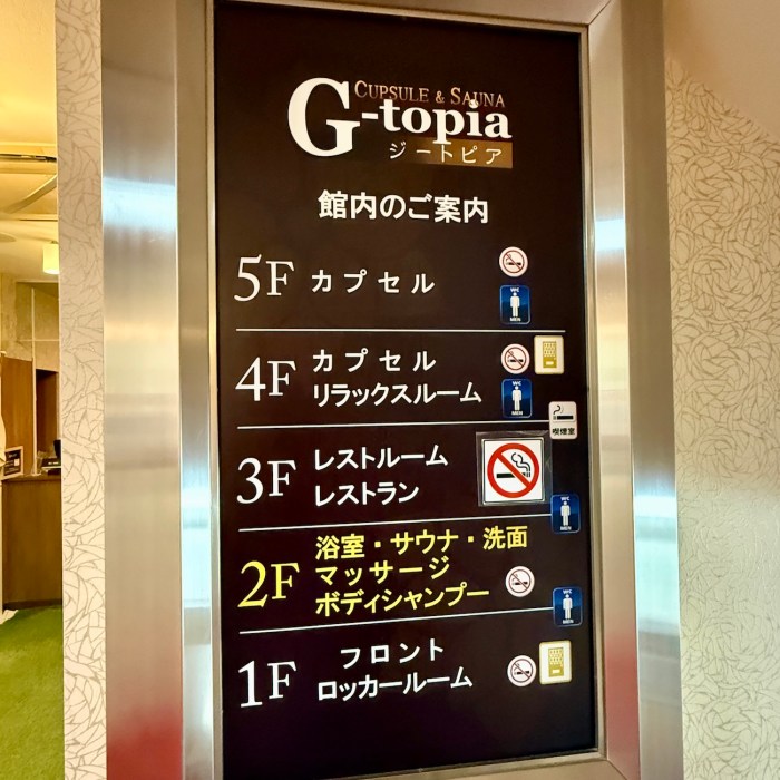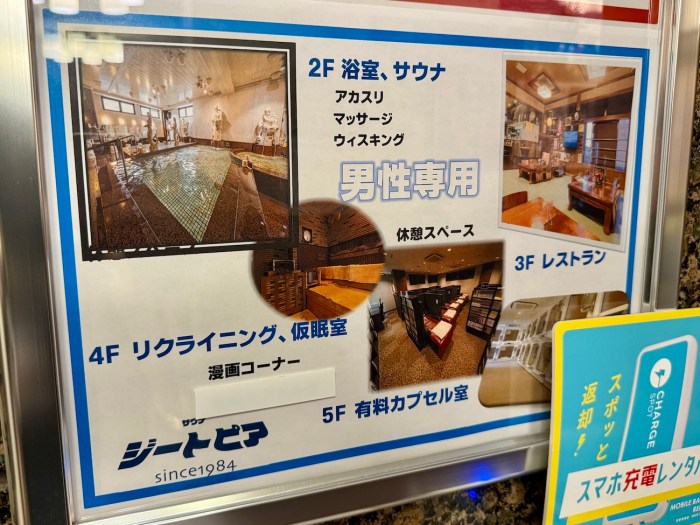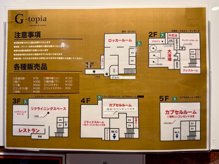 2階には大浴場、3階にはレストラン、4〜5階にはカプセルルームがある。館内図によると、リラックススペースやマッサージルーム、喫煙室やランドリーもあるらしい。
