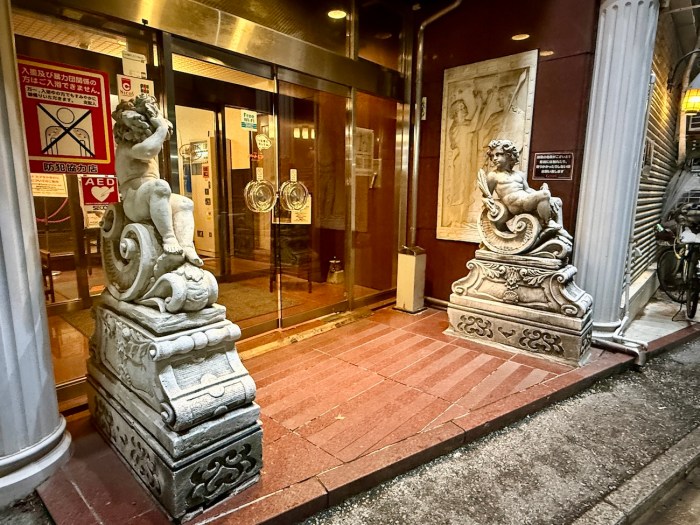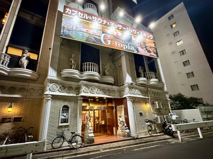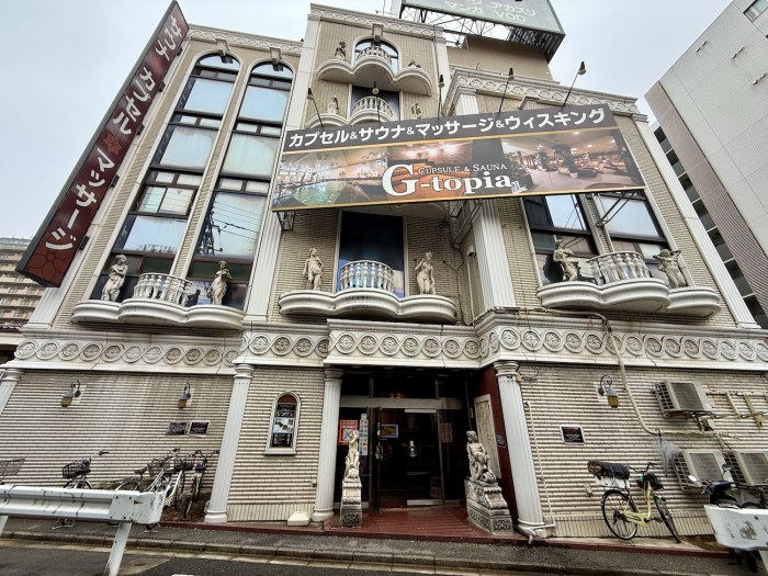 ジートピアはJR船橋駅から歩いて5分もかからない場所にある。外観はサウナ & カプセルホテルらしからぬ重厚さで、一部では “元々ラブホテル予定だった” という都市伝説もあるほど超豪華。クラシカルな柱や彫像が並び、劇場のような雰囲気を漂わせている。