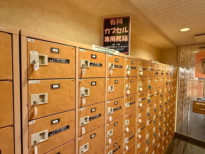 カプセル利用の場合は受付方法がちょっと独特で、まずフロントで「カプセル利用者専用の下駄箱の鍵」を受け取ってから靴を入れ、その後にチェックイン手続きをする流れとなっている。
