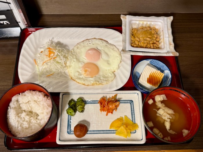 白ごはんと味噌汁、そして焼き魚、目玉焼き、納豆、漬物という王道の和定食スタイル。サウナで目覚めた朝の体に、バランスの取れた和定食が驚くほど染みる!