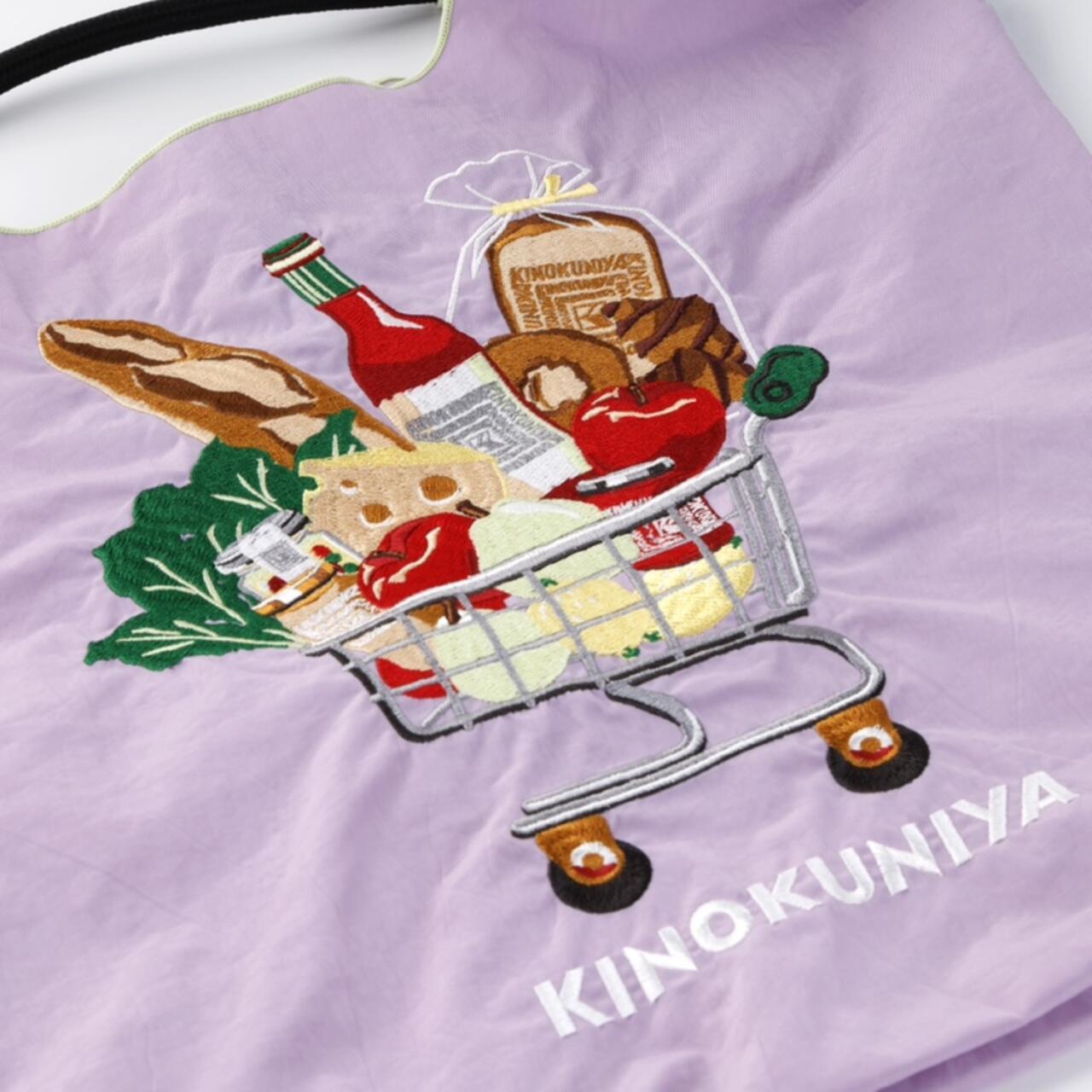 パープルにはカートに乗った彩り豊かな食材がカラフルに描かれ、ベージュには紀ノ国屋のロゴが繊細に刺繍されています。
