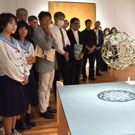 『漣』は一面の銀地の上に群青一色で漣だけを描くという大胆な発想でつくられました。一部分だけ見れば「ミミズが這っているような線」があるだけなのに、全体として見ると本当に水面に見えてきます。