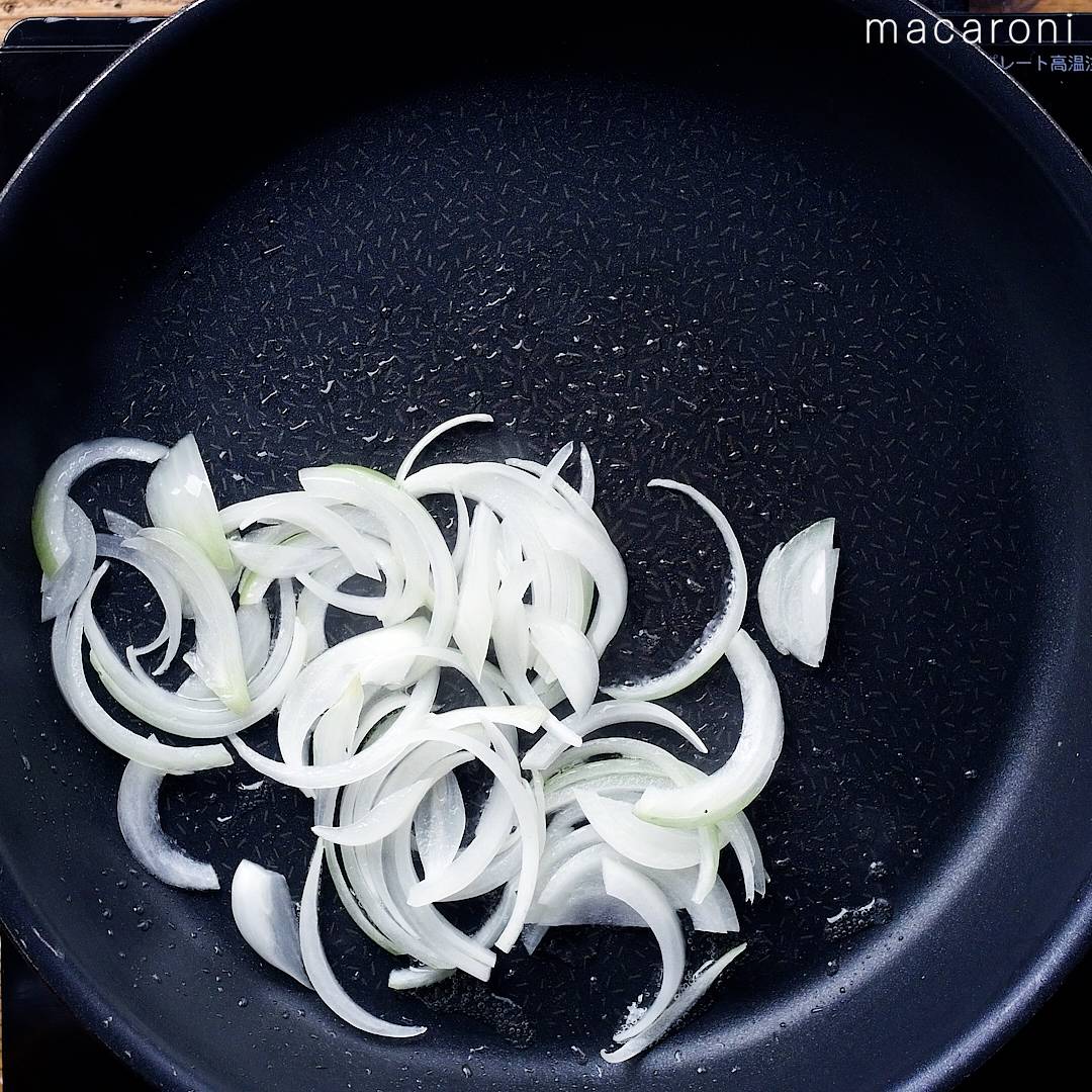 3: フライパンにサラダ油を入れて熱し、玉ねぎを入れて表面が透き通るまで炒めます。