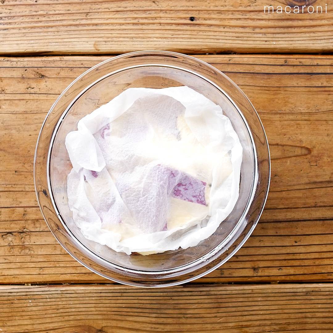 2: 耐熱容器にさつまいもを入れて濡らしたキッチンペーパーをかぶせ、ふんわりラップをかけ、レンジ600Wで3分加熱します。
