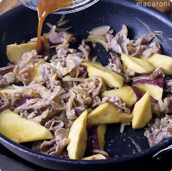 4: ①の豚肉のみを入れ、全体に火が通るまで炒めます。※漬けだれは残しておきます。