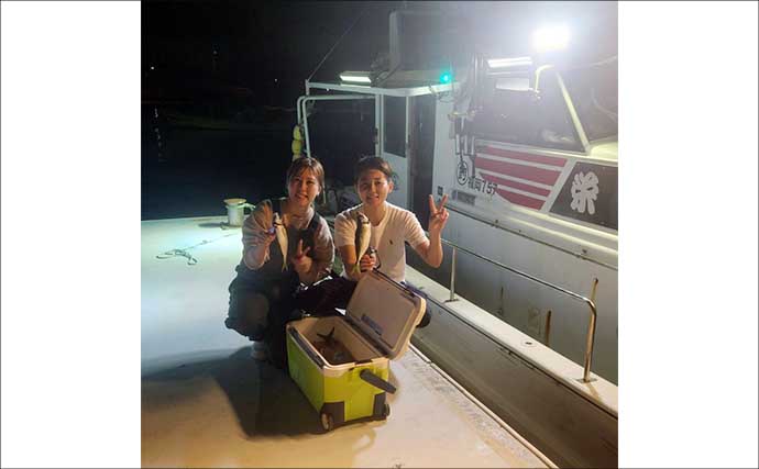 9月23日、佐賀県唐津市鎮西町串浦港から勇勝丸が呼子沖の夜焚きイカ釣りに出船。1週間ぶりの出船。数は多くないがイカのサイズがよく、井出口さんも良型をダブルでキャッチ。夜焚きイカは9月末までの出船を予定し、10月からはタイラバに出船。