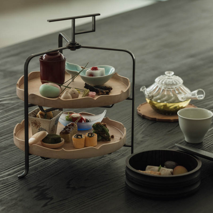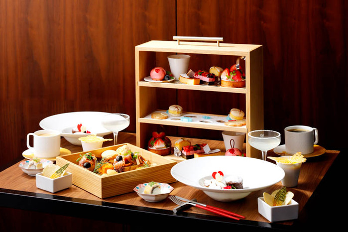 古(いにしえ)の和歌の短冊箱をイメージした雅やかな器に、シェフとパティシエが手がけたスイーツとセイボリーを盛り付け、目でも舌でも楽しめる一皿です。