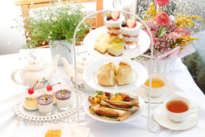 自家製のモンブランや季節のショートケーキ、定番のスコーンに加え、ガトーショコラ、マンゴープリンなど、彩り豊かなスイーツを心ゆくまで味わえます。