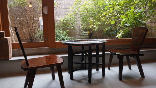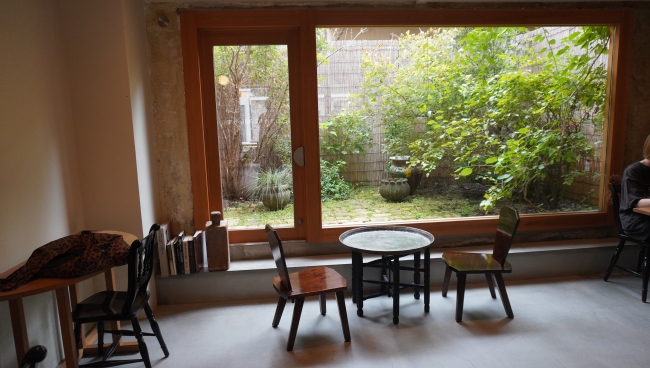 店内には大きな窓があり、朝の光がやさしく差し込む空間は、ゆったりと一日を始めるのにぴったり。窓の外には緑豊かな庭が広がり、レトロなテーブルと椅子が並ぶ落ち着いた雰囲気の中で、まるで自宅にいるかのようにくつろぐことができます。