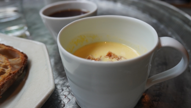 添えられたコーンスープは、ひと口いただくと甘みがふんわり広がり、やさしいコクが体にしみわたります。濃厚すぎず軽やかなので、子どもでも飲みやすい味わいです。スープは季節によって変わるそうなので、行くたびに異なる味わいを楽しめますよ。