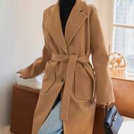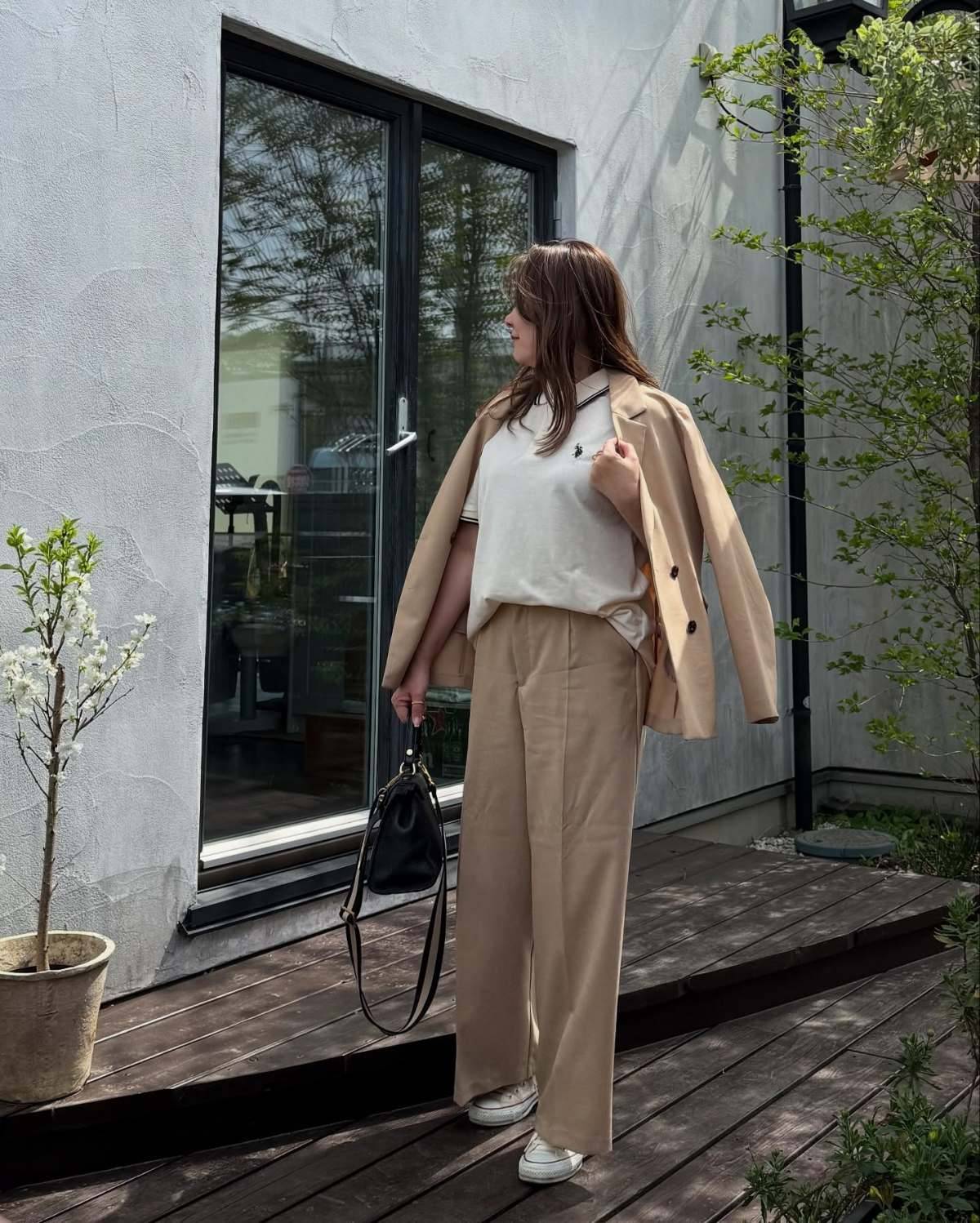 寒い日が続く11月は、パンツと同色のキャメルジャケットを肩掛けすると◎