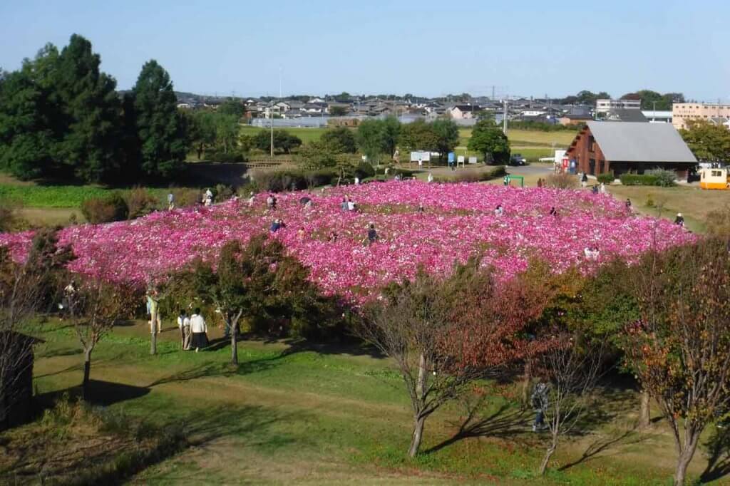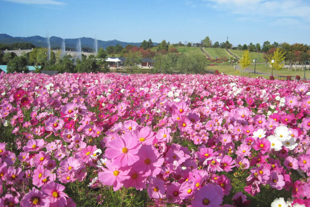 広大な敷地にコスモスが咲き乱れる名所。例年、およそ100万本ものコスモスが植えられ、例年9月中旬から10月中旬にかけて見頃を迎えます(今年は開花が遅れており、10月に入ってから開花の見込み)。一面に広がるピンクの絨毯と、遠くに見える山並みの緑のコントラストが美しく、その光景に誰もが魅了されます。