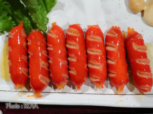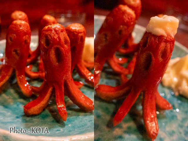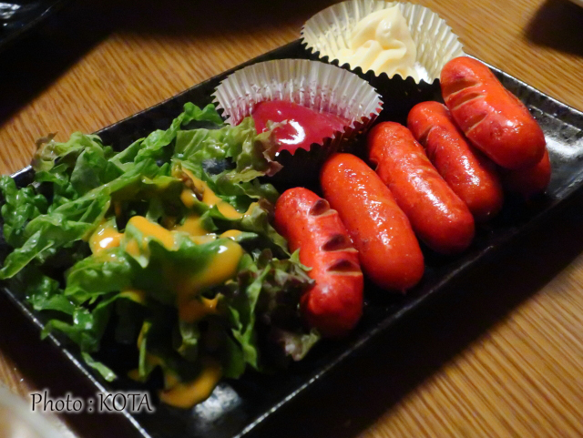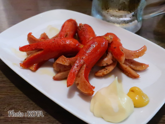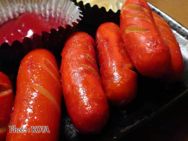夜の部は、軽いおつまみ的なメニューをメインにおもてなし。その中に赤いウインナーがあるのだが、そのこだわりがちょっと面白い。