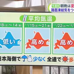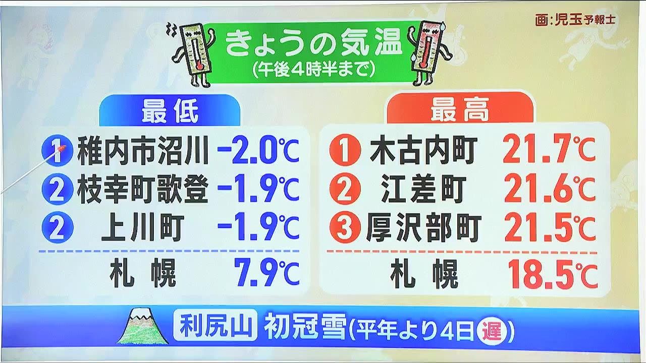 最も気温が下がったのは稚内市沼川で-2.0度。全国でこの秋初めてマイナス気温になりました。札幌も初の一ケタ7.9度まで下がりました。日中も涼しく、最も上がった渡島西部の木古内町でも21.7度など、道南でかろうじて20度に届いた程度でした。この寒気の影響で、稚内地方気象台では利尻山の初冠雪が観測されました。