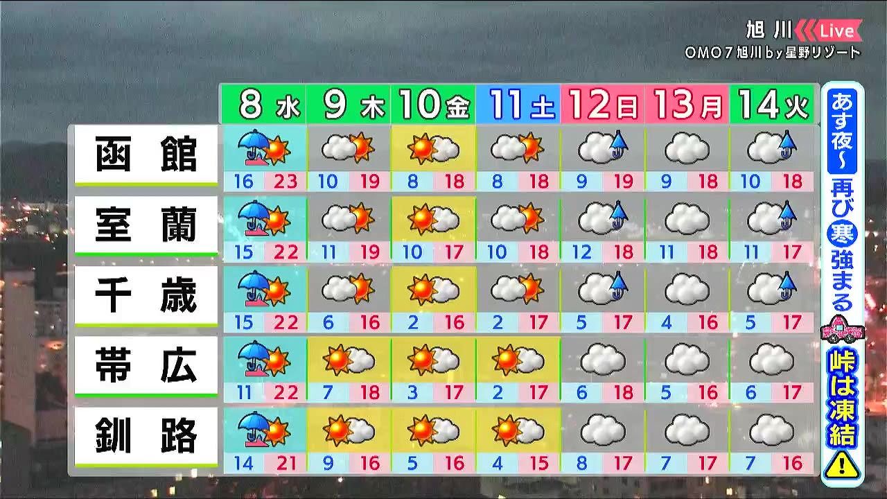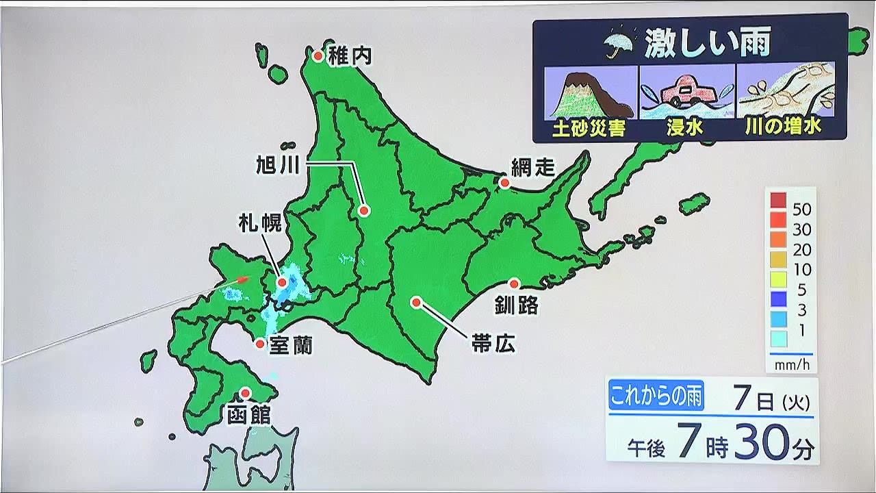 ※7日午後5時時点の情報です。最新の気象情報は、HBCウェザーセンターのホームページなどでご確認ください。HBCは気象庁の認可を2001年に得て以来、民間気象会社の一つとして「HBCの独自予報」を発信しています。