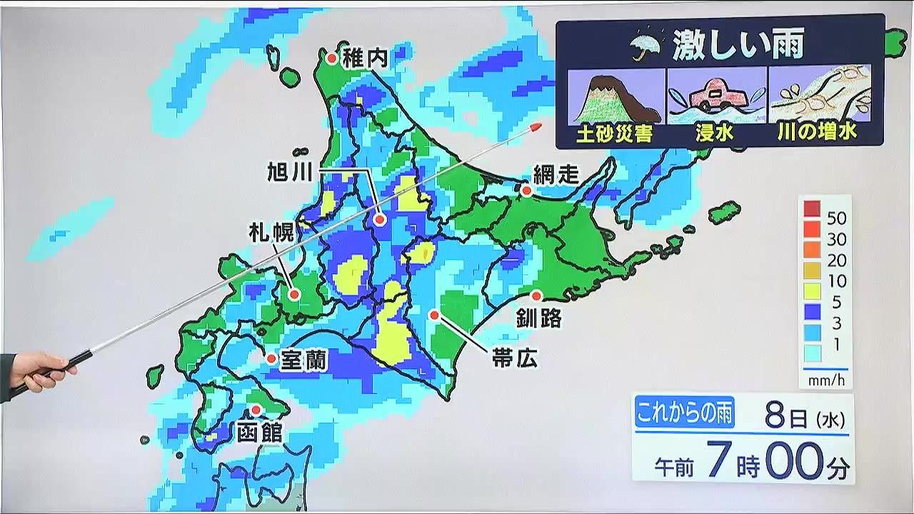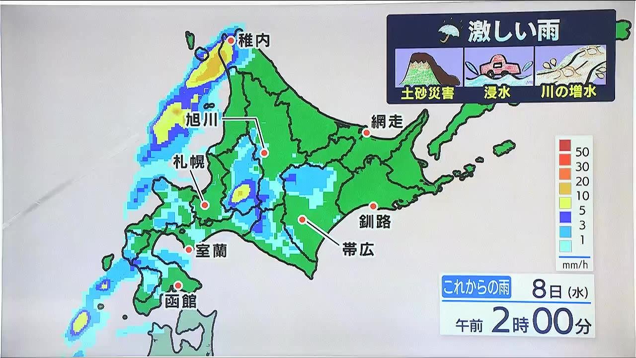 稚内です。宗谷地方では、あす8日(水)は日付が変わってから朝にかけて、1時間に30ミリとバケツをひっくり返したような激しい雨の降るおそれがあります。