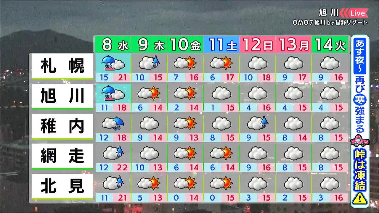 木曜も寒気の影響で札幌周辺で雨が降りそうです。その後も曇る日が多いでしょう。あす8日(水)の夜から寒気が強まるため、峠では路面凍結に注意して下さい。