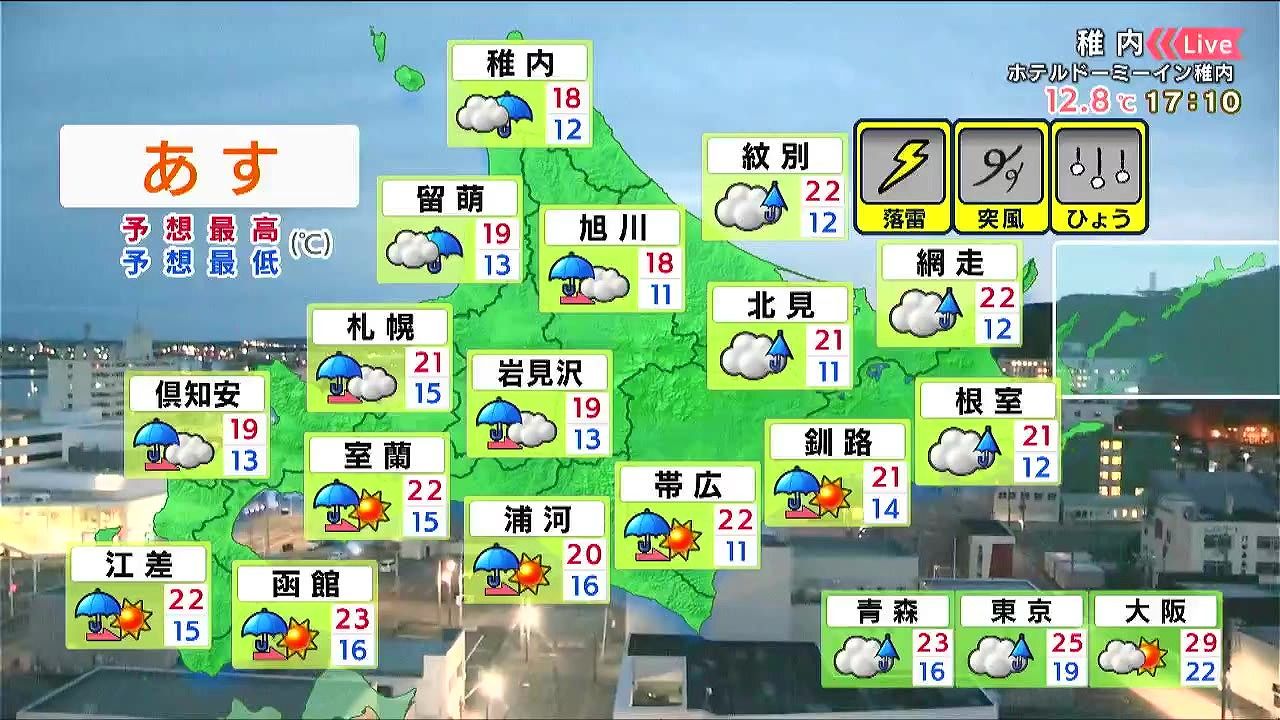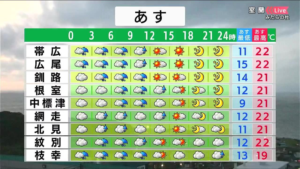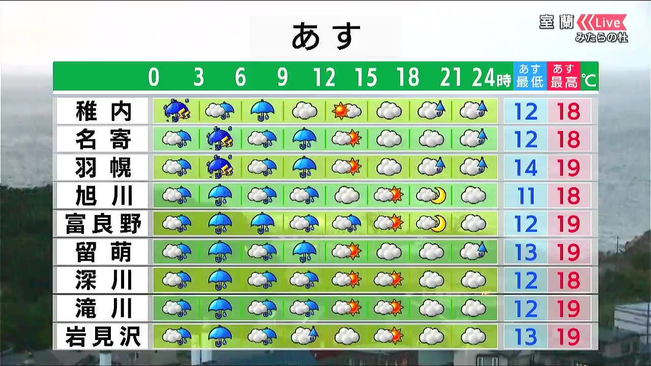午前中は雨が降り、早朝は宗谷や留萌、上川北部で激しい雷雨となりそうです。夜は寒気の影響で、海岸部を中心に弱い雨が降るでしょう。名寄の最低気温はけさより12度も高くなります。