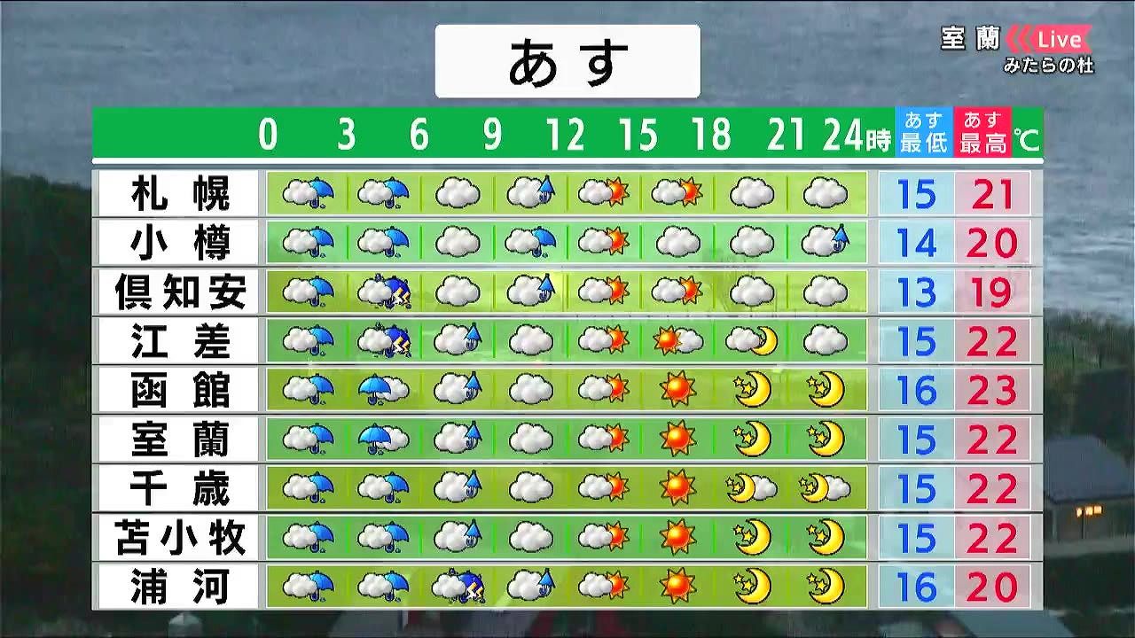 札幌など昼頃まで雨が降り、後志や檜山、日高地方を中心に雷を伴って雨が強まります。午後は北風が強まり、夜は石狩湾周辺で弱い雨が降りそうです。