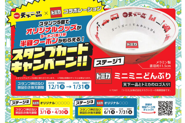 京都・北白川発祥の人気ラーメンチェーン[天下一品]で、国民的ミニカーブランド・トミカとタッグを組んだ『アプリでスタンプカードキャンペーン ステージ1』が2025年12月1日(月)から全国の店舗でスタートした。