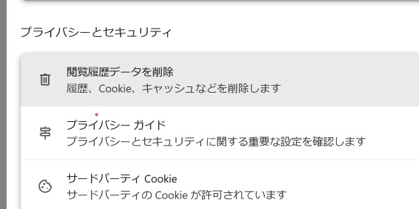 「設定」→「プライバシーとセキュリティ」→「閲覧データを削除」を選択します。「キャッシュされた画像とファイル」のみを「全期間」で削除すると、動作のもたつきや表示エラーが解消しやすくなります。※Cookieや保存されたパスワードまで削除してしまうと、各サイトで自動ログインができなくなり、再ログインが必要になります。なるべく削除しないようにしましょう。