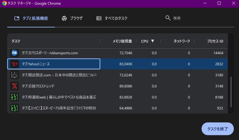 右上「︙」→「その他のツール」→「タスクマネージャー」を選択し、重いタブや拡張機能を個別に終了できます。