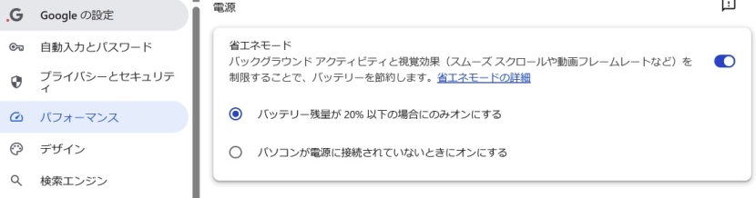 ※スマホでは、バッテリー節約設定とChrome自体の自動最適化が適用されています(個別の「省エネ」設定はありませんが、OS側でバッテリー節約モードを使うと、Chromeも自動的に省エネ動作になります)。