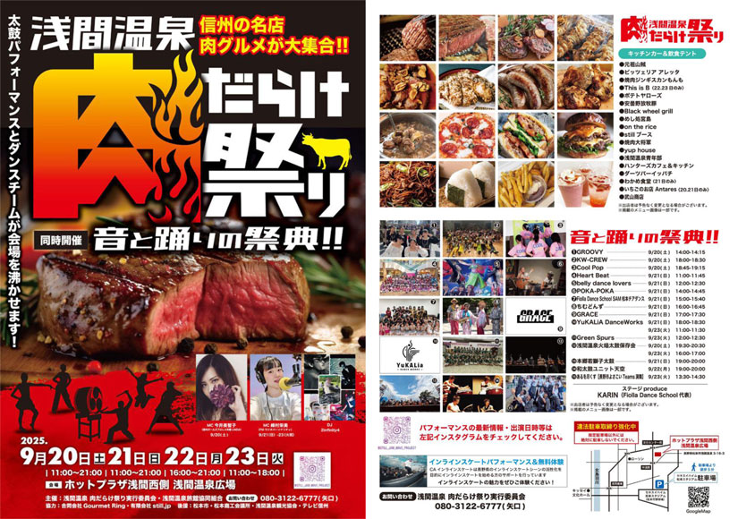 9/20(土)~9/23(火・祝)『肉だらけ祭り』名店肉グルメが大集合!夜9時まで!ステーキ・バーガー・山賊焼きなど浅間温泉で満喫!『音と踊りの祭典』同時開催@長野県松本市