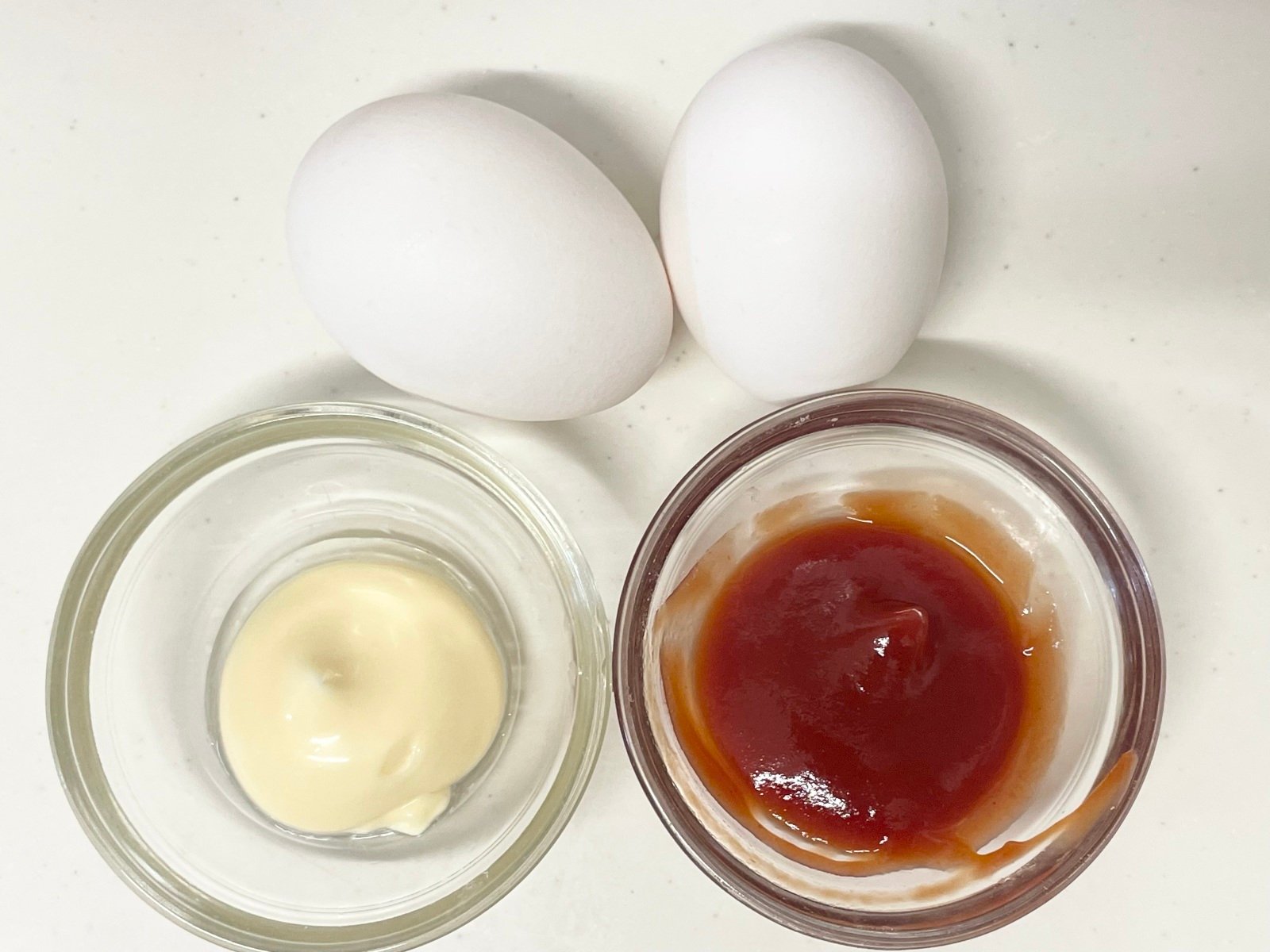 ケチャップとマヨネーズを混ぜるだけで、味玉によく合うオーロラソースが作れます。
