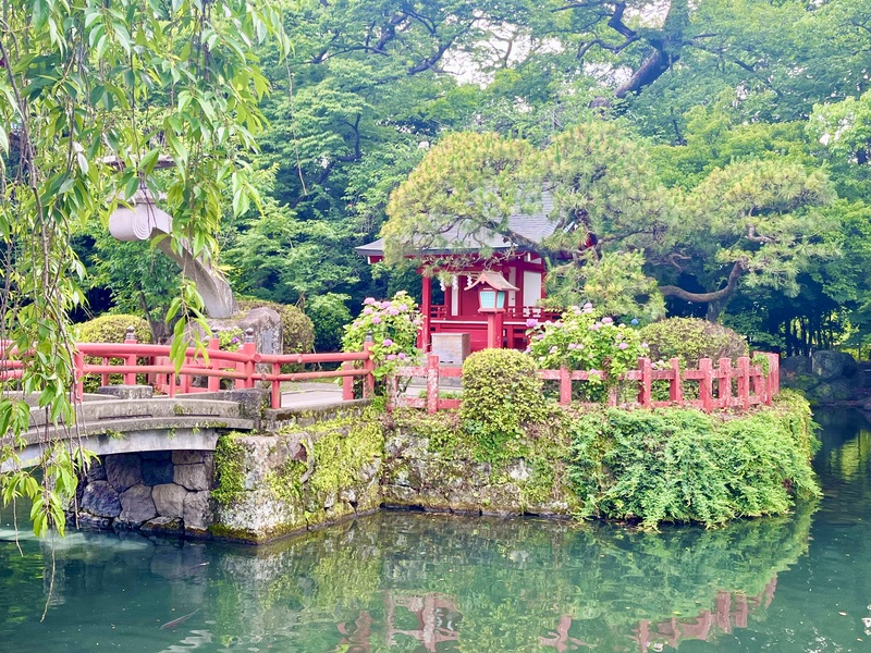 大鳥居を入った左手の池「神池」には、広島県にある厳島神社の御分霊を勧請し、頼朝が祈願達成の感謝の意を込めて建て、格別に崇敬していたと伝わっています。