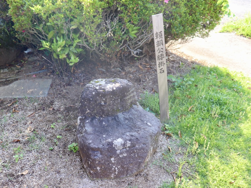 三嶋大社から徒歩5分の法華寺には、頼朝が写経した般若心経が納められ、境内には、頼朝が座ったと伝わる「頼朝公腰掛石」があります。